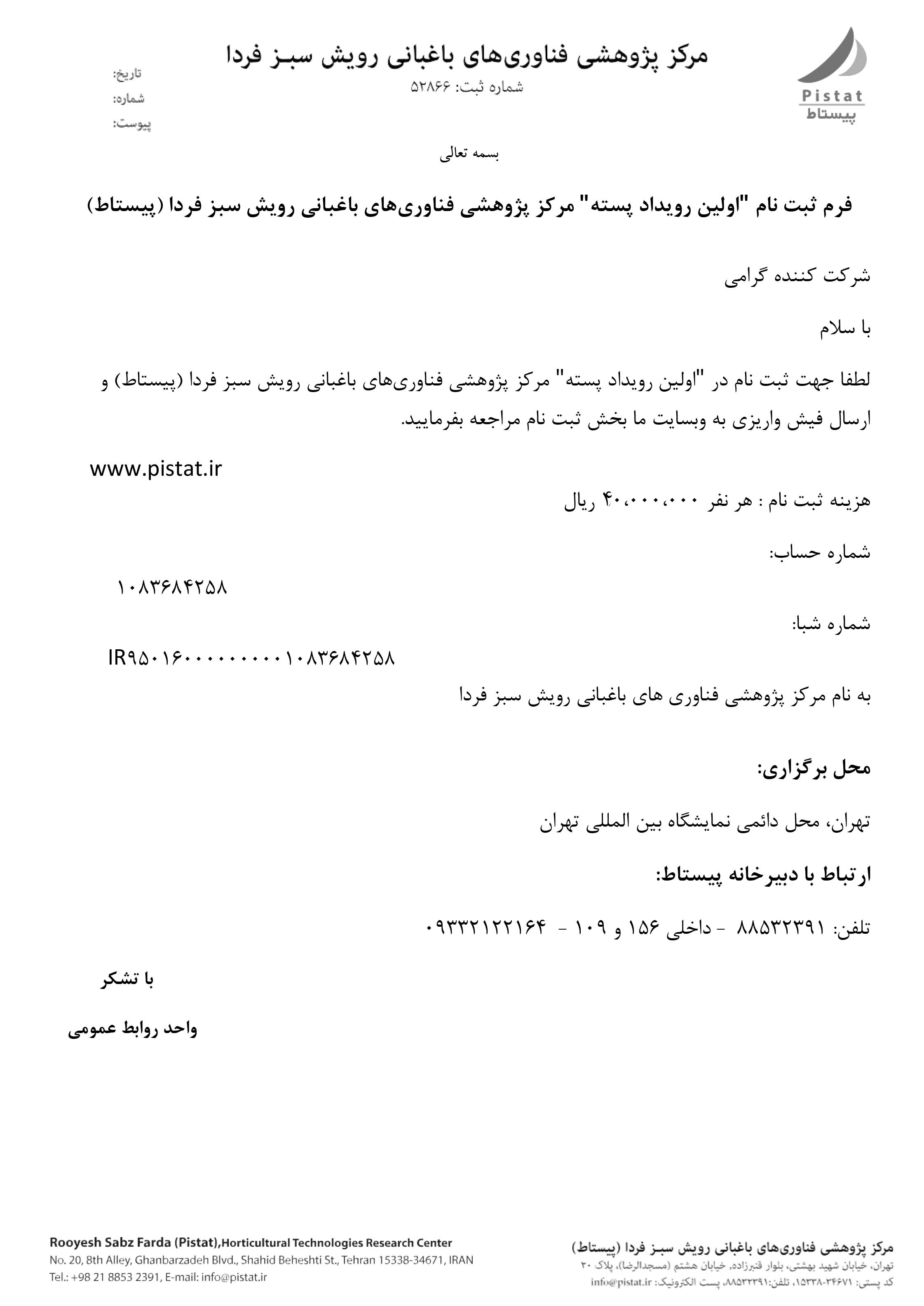 - واریز هزینه ثبتنام به شماره حساب 1083684258 یا شماره شبا IR950160000000001083684258 به نام مرکز پژوهشی فناوری های باغبانی رویش سبز فردا